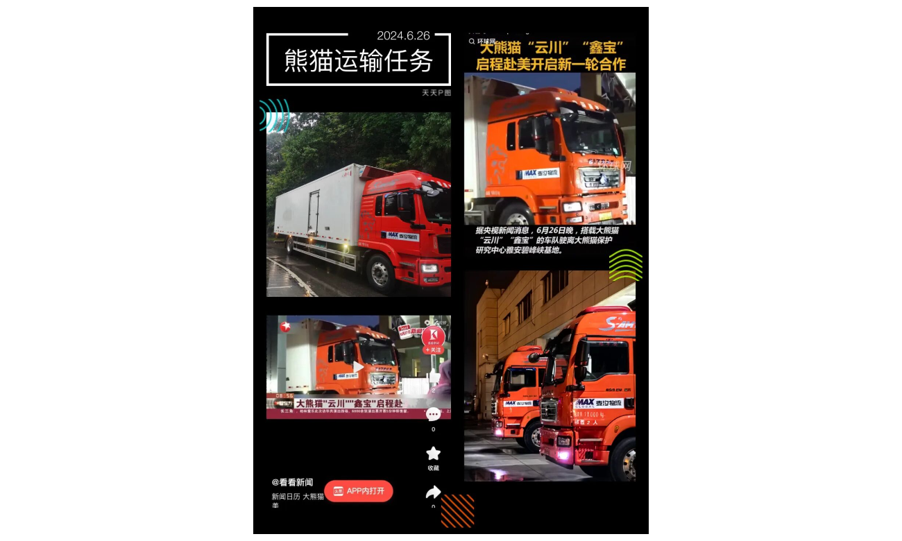 据央视新闻消息,6月26日晚,搭载大熊猫"云川”“鑫宝”的车队驶离大熊猫保护研究中心雅安碧峰峡基地。