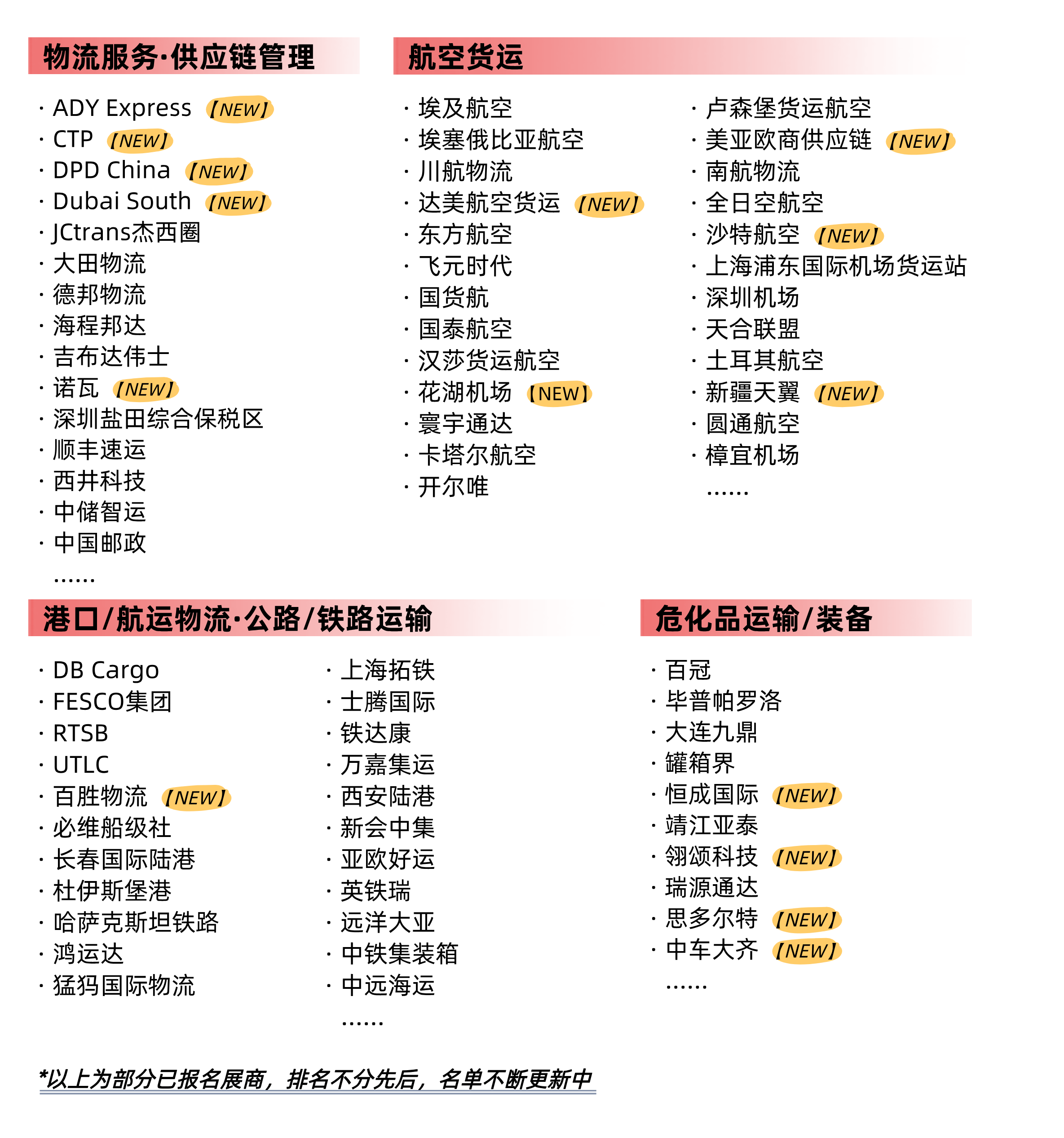 来自物流服务、航空货运、港口/航运物流、公路/铁路运输、物流地产/仓储园区、生鲜供应链/冷链物流、智慧物流/IT信息系统、物流设备、项目物流及专用车辆等领域的全球物流企业踊跃加入这场行业盛会,这其中既有已连续参展多届的老展商,也不乏初次参与的行业新面孔,一场激烈的“抢位大战”已然上演。