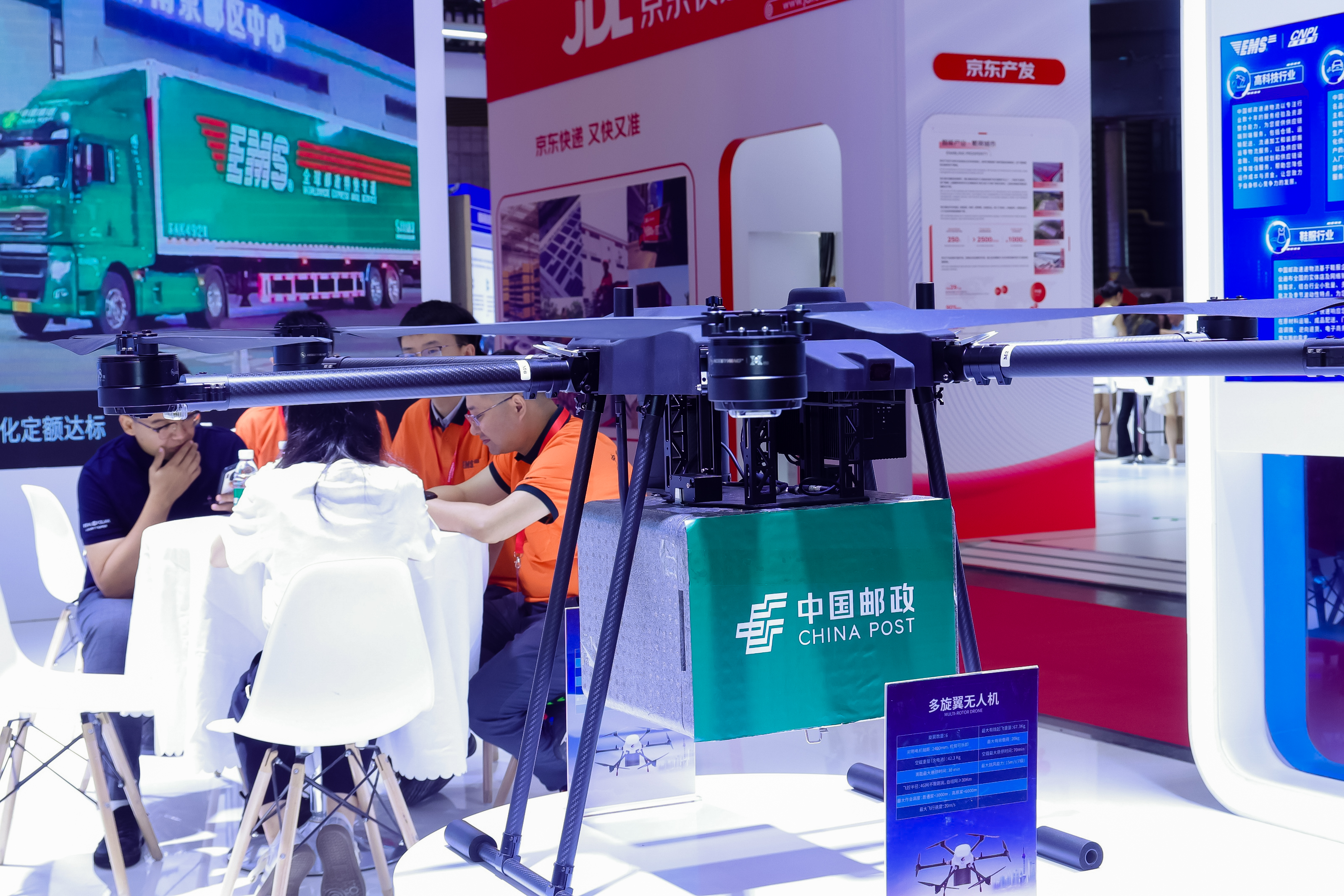 (2024亚洲物流双年展现场,中国邮政展示其在无人机方面的重大成果与多场景应用。)